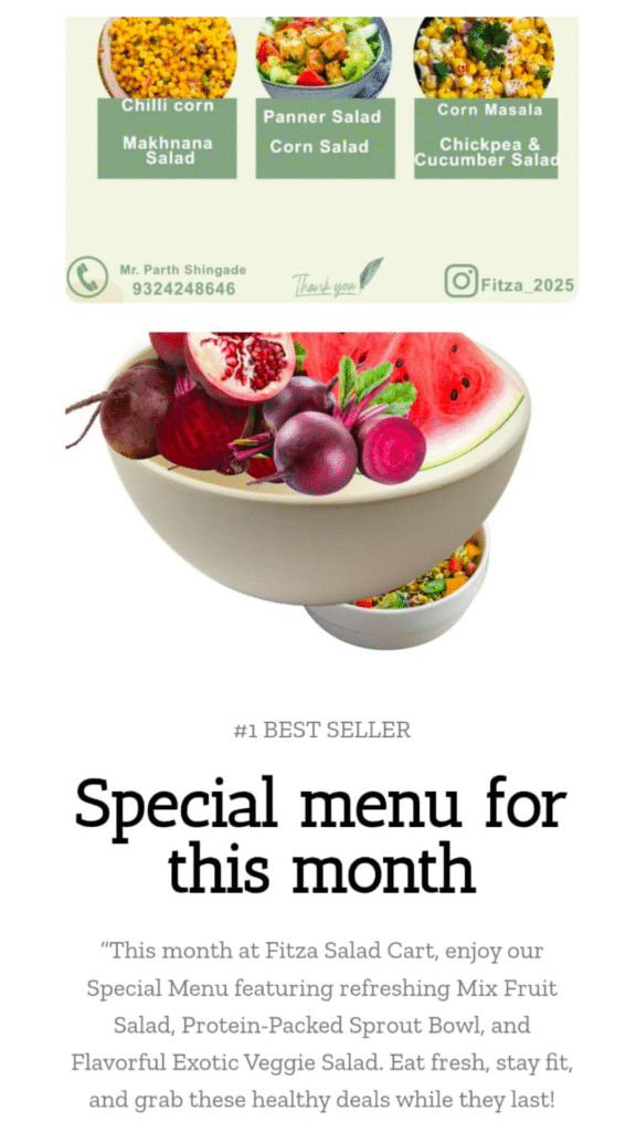 “This month at Fitza Salad Cart, enjoy our Special Menu featuring refreshing Mix Fruit Salad, Protein-Packed Sprout Bowl, and Flavorful Exotic Veggie Salad. Eat fresh, stay fit, and grab these healthy deals while they last!